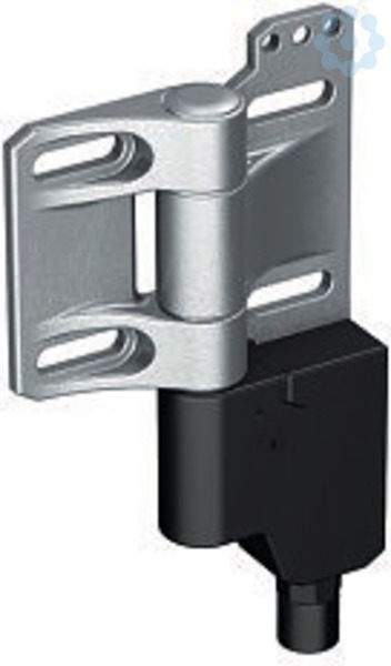 Sicherheitstechnik, Sicherheitsschalter, Türscharnierschalter, Erfüllt IEC 60947-5-1, Sicherheitsschalter in einem sehr robusten PBT-Gehäuse integriert, Schaltpunkt ist repositionierbar, Manipulationssicher, Schaltpunkt ist über den Rotatiosbereich von 0° bis 270° einstellbar, Schalter können umgewandelt und von der gegenüberliegenden Seite betrieben werden, Zinkdruckguss-Scharnier unterstützt eine Last von 1200 N (120 kg), Bei korrekter Verbindung oder Anschluß an einen entsprechenden Kontroller können zwei SI-HG(Z)63 Schalter Sicherheitskategorie 4 erreichen, nach ISO 13849-1, 2 Öffner-, 1 Schließer-Kontakt, Rechts-Scharnier, Gewinkelter Steckverbinder