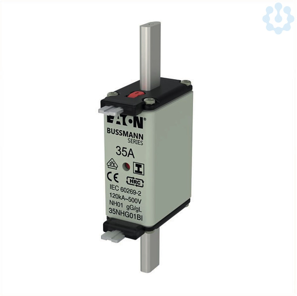 Sicherung. Sicherungseinsatz. Niederspannung. 35 A. AC 500 V. NH01. gL/gG. IEC. duales (Kombinations-) Kennmeldersystem. Quadratischer Körper mit Messerkontakten. Isolierte Grifflaschen. IEC 60269-2 Sicherungssystem A. DIN 43620. VDE 0636-2. Ausschaltvermögen 120 kA