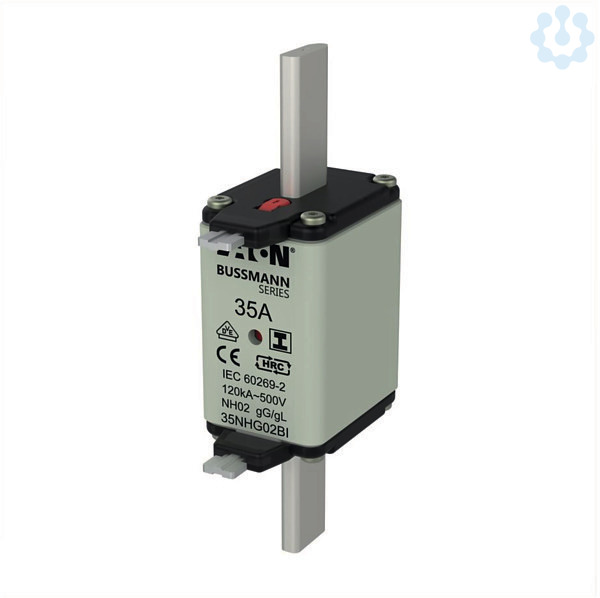 Sicherung. Sicherungseinsatz. Niederspannung. 35 A. AC 500 V. NH02. gL/gG. IEC. duales (Kombinations-) Kennmeldersystem. Quadratischer Körper mit Messerkontakten. Isolierte Grifflaschen. IEC 60269-2 Sicherungssystem A. DIN 43620. VDE 0636-2. Ausschaltvermögen 120 kA