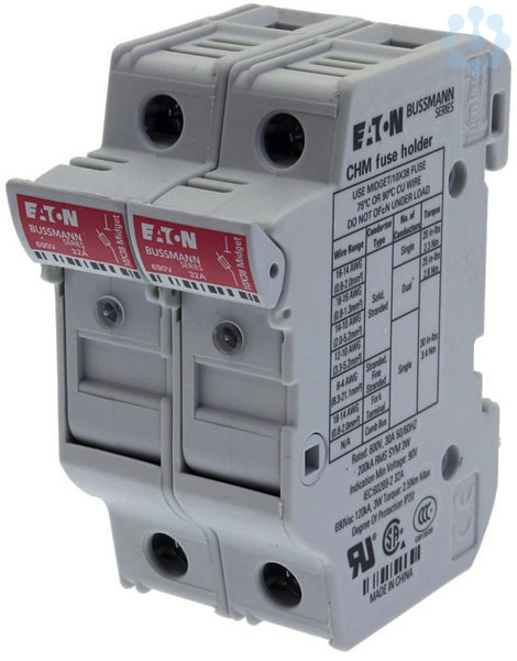 Sicherungszubehör, Sicherungshalter, Niederspannung, 32 A, AC 690 V, 10 x 38 mm, 2P, UL, IEC, mit Kennmelder, DIN-Schienenmontage, modular, farbcodiert. Ausgelegt zur Verwendung mit Drähten für 75°C oder 90°C, dünnen Litzen, Flachsteckern und Kamm-Busschienen. Verwendung von Leitungen mit höherer Temperaturbemessung bei entsprechender Leitungsverringerung. Für zylindrische Sicherungseinsätze, für Kleinstsicherungen, IEC, cULus, CCC, CSA, UR
