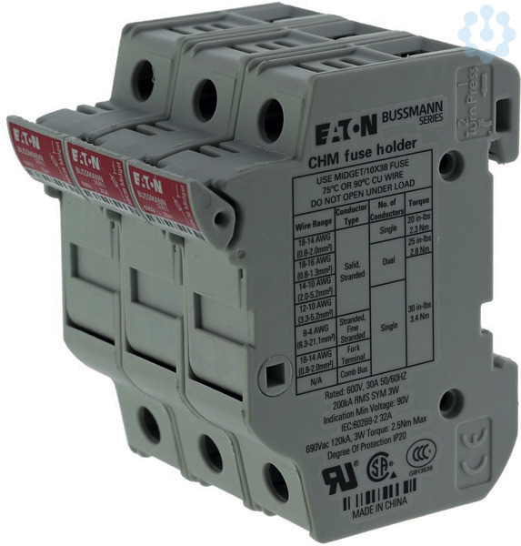 Sicherungszubehör, Sicherungshalter, Niederspannung, 32 A, AC 690 V, 10 x 38 mm, 3P, UL, IEC, DIN-Schienenmontage, modular, farbcodiert. Ausgelegt zur Verwendung mit Drähten für 75°C oder 90°C, dünnen Litzen, Flachsteckern und Kamm-Busschienen. Verwendung von Leitungen mit höherer Temperaturbemessung bei entsprechender Leitungsverringerung. Für zylindrische Sicherungseinsätze, IEC, cULus, CCC, CSA, UR