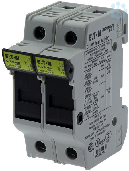Sicherungszubehör, Sicherungshalter, Niederspannung, 32 A, DC 1000 V, 10 x 38 mm, gPV, 2P, UL, IEC, DIN-Schienenmontage, modular, farbcodiert. Ausgelegt zur Verwendung mit Drähten für 75°C oder 90°C, dünnen Litzen, Flachsteckern und Kamm-Busschienen. Verwendung von Leitungen mit höherer Temperaturbemessung bei entsprechender Leitungsverringerung. Für zylindrische Sicherungseinsätze, Photovoltaik, IEC, cULus, CCC, CSA, UR