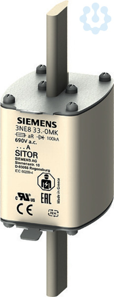SITOR-Sicherungseinsatz, mit Messerkontakten, NH2, In: 630 A, aR, Un AC: 690 V, Un DC: 440 V, Stirnkennmelder Halbleiterschutzsicherungen SITOR 3NE, 3NC schützen Leistungshalbleiter vor den Auswirkungen eines Kurzschlusses. Das SITOR-Sicherungssystem von Siemens als wichtiger Bestandteil der SENTRON Schutzkomponenten für die Elektroinstallation bietet effektiven Personen-, Geräte- und Anlagenschutz durch sicheres Abschalten im Überlast- und Kurzschlussfall. Der Einsatzbereich umfasst zusätzlich Frequenzumrichter mit Sicherungen im Eingangs- und im DC-Zwischenkreis sowie auch USV-Anlagen und Sanftstarter für Motoren. Die Siemens SITOR-Sicherungen zeichnen sich vor allem aus durch: 1. Superflinke Abschaltcharakteristik im Vergleich zu herkömmlichen NH-Sicherungen. 2. Auch Leistungshalbleiter werden bei Kurzschluss sicher geschützt. 3. Der Siemens Qualitätsstandard sichert eine sehr gute Kennlinientreue. 4. SITOR-Zylindersicherungen sind nach IEC und UL und größtenteils auch CCC zugelassen und damit weltweit ein