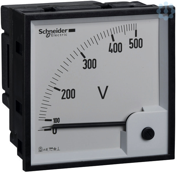 Analoge Amperemeter AMP und Voltmeter VLT für Fronteinbau, 96 x 96 mm. 1,3 x In Skala. Anschluss über Stromwandler TI 600/5, Messbereich 0-600 A.