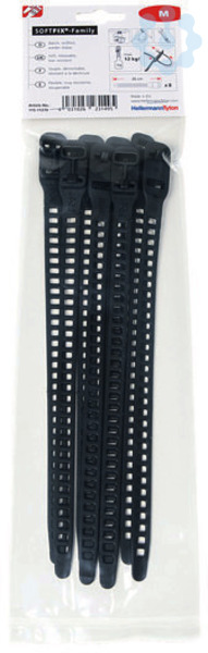 Elastischer Kabelbinder mit gerundeten Kanten. Flexibel auch bei niedrigen Temperaturen bis -20 °C. Kann wieder geöffnet und erneut verwendet werden. Doppelter Verschlusskopf zur Parallelbündelung. Dehnspannung ermöglicht sehr festen Sitz auf dem Bündel. Gleichmäßige Druckverteilung auf dem Bündel. Sicherer Halt auch in vertikaler Position verhindert das Herausgleiten des Bündels. Langlebig beim Verbau im Innenbereich. Aufgrund des elastischen und reißfesten Materials eignen sich diese Kabelbinder besonders für die Bündelung und Fixierung von vibrierenden, beweglichen oder pulsierenden Leitungen und Schläuchen, wie zum Beispiel in den Bereichen Windenergie, Bau- und Agrarmaschinen sowie Robotersystemen. Als Wiederöffnungsbinder finden sich zahlreiche Anwendungen für temporäre Befestigung im Bühnen- und Messebau oder auf Musikveranstaltungen. Im Montagewagen sorgt dieser Kabelbinder für Ordnung.