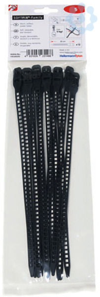 Elastischer Kabelbinder mit gerundeten Kanten. Flexibel auch bei niedrigen Temperaturen bis -20 °C. Kann wieder geöffnet und erneut verwendet werden. Doppelter Verschlusskopf zur Parallelbündelung. Dehnspannung ermöglicht sehr festen Sitz auf dem Bündel. Gleichmäßige Druckverteilung auf dem Bündel. Sicherer Halt auch in vertikaler Position verhindert das Herausgleiten des Bündels. Langlebig beim Verbau im Innenbereich. Aufgrund des elastischen und reißfesten Materials eignen sich diese Kabelbinder besonders für die Bündelung und Fixierung von vibrierenden, beweglichen oder pulsierenden Leitungen und Schläuchen, wie zum Beispiel in den Bereichen Windenergie, Bau- und Agrarmaschinen sowie Robotersystemen. Als Wiederöffnungsbinder finden sich zahlreiche Anwendungen für temporäre Befestigung im Bühnen- und Messebau oder auf Musikveranstaltungen. Im Montagewagen sorgt dieser Kabelbinder für Ordnung.