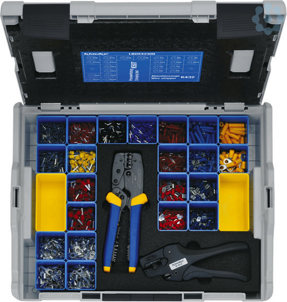 Aus stoß- und schlagfestem ABS-Kunststoff hergestellt. Sehr robust, belastbar bis 100 kg. Über ein Easy-Klick-System stapelbar, das sich leicht öffnen und schließen lässt. Lieferumfang: Automatische Abisolierzange K43/2 0,02 - 10 mm² (K432) 1 Stück, Presswerkzeug mit auswechselbaren Einsätzen (K507) 1 Stück, isol. Flachsteckhülse 6,3x0,8 mm DIN 46245 Teil 3, 0,5-1 mm² (720) 50 Stück, isol. Flachsteckhülse 6,3x0,8 mm DIN 46245 Teil 3, 1,5-2,5 mm² (730) 50 Stück, isol. Flachstecker 6,3x0,8 mm, 0,5-1 mm² (820) 50 Stück, isol. Flachstecker 6,3x0,8 mm,1,5-2,5 mm² (830) 50 Stück, isol. Qütschkabelschuh M4 DIN 46237, isolierhülse PA, 0,5-1 mm² (6204) 50 Stück, isol. Qütschkabelschuh M5 DIN 46237, isolierhülse PA, 1,5-2,5 mm² (6305) 50 Stück, isol. Qütschkabelschuh M6 DIN 46237, isolierhülse PA, 4-6 mm² (6506) 50 Stück, isol. Stoßverbinder, 0,5-1 mm² (670) 50 Stück, isol. Stoßverbinder, 1,5-2,5 mm² (680) 50 Stück, isol. Stoßverbinder, 4-6 mm² (700) 25 Stück, Quetschkabelschuhe DIN 46234, 4-6 mm², M5, Cu verzinnt (165