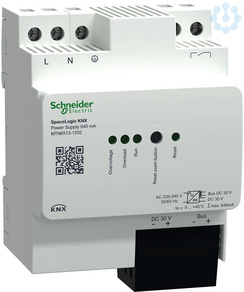 KNX Spannungsversorgung 640mA, REGSpaceLogic KNX Spannungsversorgung 640mAbestimmungsgemäßer Gebrauch-Versorgung von KNX-Geräten mit Busspannung-Versorgung von Geräten mit Gleichspannung-Zur Montage auf DIN-Schienen TH35 nach EN 60715. Der Bus wird über eine Busanschlussklemme angeschlossen. Die SpaceLogic KNX-Stromversorgung erzeugt die Busspannung für die KNX Linie. Die Stromversorgung hat zwei Ausgänge-einen KNX-Ausgang mit integrierter Drossel und einen -DC 30 V-Ausgang für zusätzliche Geräte.Zwei identische Spannungsversorgungen können parallel geschaltet werden, um den Ausgangsstrom zu verdoppeln. Die Spannungsversorgung verfügt über einen potentialfreien Meldekontakt für Betriebs-und Diagnosemeldungen.Merkmale: -Der Nennstrom kann beliebig verteilt werden. Reset-Taste zum Abschalten der Stromversorgung und zum Zurücksetzen der Busgeräte. Kurzschlussfest-Überspannungsfest -Leerlauffest -Für den Betrieb in Anlagen mit Notstromversorgung. Technische Daten:Nennspannung: 220-240 V ACNetzfrequenz: 50/60 HzVe