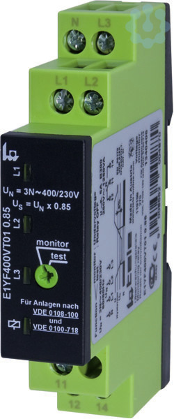 Für Anlagen nach VDE 0108-100 und VDE 0100-718 Messspannung = Versorgungsspannung Schaltschwelle fix U x 0,85 Versorgungsspannung 3x 400/230VAC 3 LED zur Phasenanzeige Test - Funktion 1 Wechsler Baubreite 17.5mm Installationsbauform