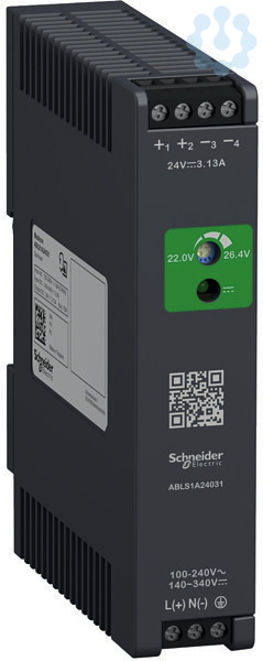 Spannungsversorgung Modicon der Baureihe OPTIMUM für Anwendungen in der Industrie sowie Gewerbe- und Wohngebäude. Ausgang mit 24V/3,1A. Nennleistung 75W. Kunststoffgehäuse zur Aufrastung auf einer Hutschiene. 1-Phasig. Mögliche Betriebstemperatur bis +70°C. Gehäusefarbe ist dunkelgrau. Eingang unten, Ausgänge oben am Gerät. Eingangsspannung 100-240 VAC (50/60 Hz). Zugang zu Dokumentation per QR-Code auf dem Gerät. IEC/EN 62368-1 konform, CE, CB-Scheme,cULus,cURus,RCM,EAC. Die Baureihe Modicon ABLS OPTIMUM umfasst Spannungsversorgungen mit Ausgangsspannungen von 12VDC, 24VDC oder 48VDC.