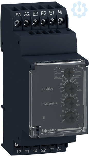 Zelio Control. Dieser Multifunkions-Spannungswächter wird in Gleich- und Wechselspannungsnetzen eingesetzt und ermöglicht die Überwachung auf Über- oder Unterschreitung eines einstellbaren Grenzwertes (0,05-5 VAC/DC). Dazu ist der Grenzwert, die Schalthysterese und ein Abschaltverzögerung einstellbar. Am Ausgang stehen zwei Relaiswechsler zur Verfügung, die bis 5 A belastet werden können. Optional ist ein Fehlerspeicher wählbar, der die Meldung bis zu einem Reset hält. 2 LEDs zeigen den Gerätzustand an. Das Weitspannungsnetzteil (24-240 VAC/DC) ermöglicht einen universellen Einsatz. Der Leitungsanschluss erfolgt über Schraubklemmen.
