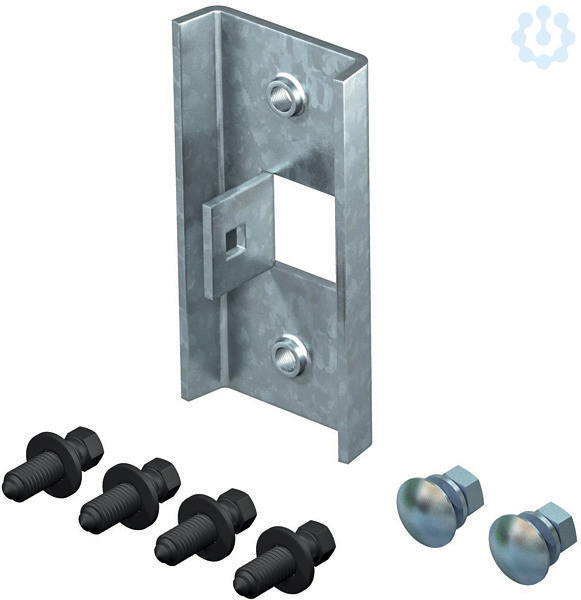 Sprossenaufnahme für die Befestigung von Sprossen des Typ MS4022 in Stahlträgern. Das Set besteht aus jeweils zwei Sprossenaufnahmen, 2 Sechskantschrauben M8 x 16 mm und 4 Sechskantschrauben mit Ansatzspitze M10 x 30.