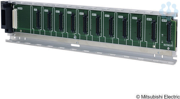 Der Hauptbaugruppenträger (Standard- und erweiterter Temperaturbereich) dient der Aufnahme und Kopplung von bis zu vier CPUs, Netzteil sowie Eingangs-, Ausgangs- und Sondermodulen. Nutzbar für Standardmodule der iQ-R-Serie. Alle Baugruppenträger sind mit Bohrungen für M4-Schrauben versehen. Adapter für DIN-Schienenmontage verfügbar.