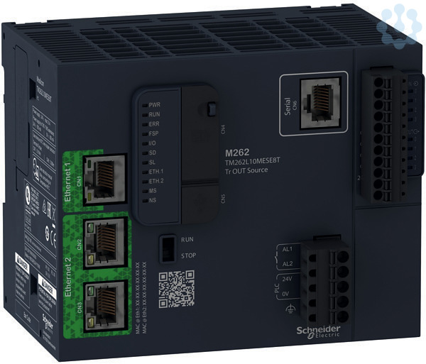 SPS-Steuerung Modicon M262. Leistungsstarker IIoT-fähige Controller (5ns/Anweisung) für anspruchsvolle Maschinen mit integrierter Cloud-Konnektivität und Cybersecurity. Bietet als Teil von Schneider Electrics IoT-fähiger, offener und interoperablen EcoStruxure Systemarchitektur Maschinenherstellern einzigartige Möglichkeiten intelligentere und vernetztere Maschinen anzubieten sowie digitale Services. Unterstützt Cloud-Protokolle (MQTTs, HTTPs, OPC-UA) und -Datenformate (JSON) sowie Verschlüsselung (TLS). Bis zu 5 getrennten Ethernet-Ports erlauben eine sichere Netzwerksegmentierung. Skalierbare E/A-Architektur dank erweiterungs und dezentralen Konfigurationen. Volle Integration der Modicon TM3, TM5 und TM7 E/A-Systeme einschliesslich Modulen für funktionale Sicherheit. 2 eingebettete und seperate Ethernetnetzwerke mit Ethernet/IP und Modbus/TCP, eines mit einem Port und 100 Mbit/s sowie eines mit zwei Ports und 1 Gbit/s die Daisy-Chain und RSTP ermöglichen. Verfügbare Ethernetdienste sind u.a. MQTTs, TLS, OPC