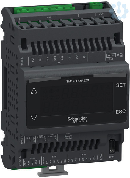 Die SPS Steuerung Modicon M173 in Optimized Ausführung ist Teil der Modicon M171/M172/M173-Reihe, einem Regelungsangebot für HLK/Pumpenanwendungen. Die Steuerung verfügt über 6 digitale Eingänge, 7 analoge Eingänge, 5 digitale Ausgänge (Relais), 4 analoge Ausgänge. Mit integrierten und optionalen Schnittstellen ist die Steuerung flexibel vernetzbar. Integriert sind zwei RS485 Schnittstellen und einen CAN-Erweiterungsbusanschluss. Es handelt sich um eine programmierbare Logiksteuerung komplette Automatisierungslösungen für HLK- und Pumpenanlagen konzipiert und ist mit einem LCD-Display ausgestattet. Die Steuerung ist kompatibel ist mit E/A-Erweiterungsmodulen und Secure Interfaces. Die Spannungsversorgung erfolgt über 24 VAC / 24 VDC. Die Anschlüsse erfolgen mittels abnehmbaren Schraubklemmleisten (im Lieferumfang enthalten). Die Montage erfolgt auf einer 35mm Hutschiene oder Montageplatte mit Befestigungszubehör. Wird mit kostenfreier Software EcoStruxure Machine Expert - HVAC programmiert.