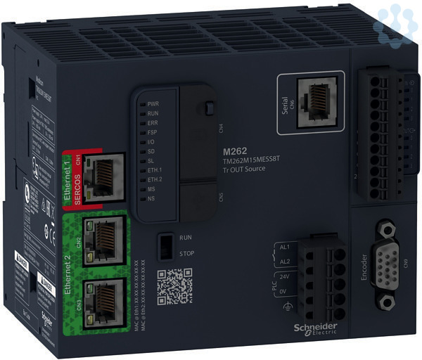 SPS/Motion-Controller Modicon M262. Leistungsstarker IIoT-fähige Controller (5ns/Anweisung) mit Motion-Schwerpunkt (4 Achsen) für anspruchsvolle Maschinen mit integrierter Cloud-Konnektivität und Cybersecurity. Bietet als Teil von Schneider Electrics IoT-fähiger, offener und interoperablen EcoStruxure Systemarchitektur Maschinenherstellern einzigartige Möglichkeiten intelligentere und vernetztere Maschinen anzubieten sowie digitale Services. Unterstützt Cloud-Protokolle (MQTTs, HTTPs, OPC-UA) und -Datenformate (JSON) sowie Verschlüsselung (TLS). Bis zu 5 getrennten Ethernet-Ports erlauben eine sichere Netzwerksegmentierung. Skalierbare E/A-Architektur dank erweiterungs und dezentralen Konfigurationen. Volle Integration der Modicon TM3, TM5 und TM7 E/A-Systeme einschliesslich Modulen für funktionale Sicherheit. Integrierte Sercos III Echtzeit-Feldbus Schnittstelle auf Ethernet-Port für Motionanwendungen und integrierter Sicherheit mittels Erweiterung durch Sicherheits-SPS (SLC) und -E/As mit TM5/TM7. 2 eingebe
