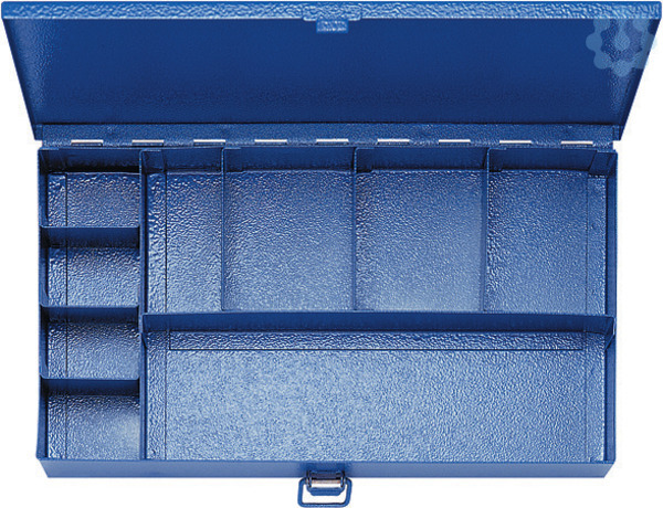 Hammerschlaglackierter Sortimentskasten, 8 kleinere und 1 größeres Leerfach mit Verschluss. Zur wahlweisen Aufbewahrung der Presswerkzeuge K3, K35. Abmessungen 285x155x45 mm, Gewicht: 1,3 kg.