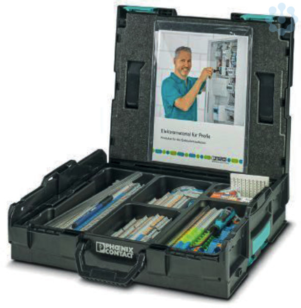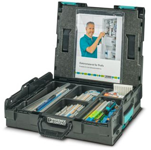Starterkit, Installationsklemmen-Starterset im praktischen Sortimo-Systemkoffer L-BOXX 102. 108 PTI-Installationsklemmen, Querschnitt 0,14 mm² bis 16 mm², 19 Abschlussdeckel, 5 Auflageböcke, 20 Steckbrücken, 1 Schraubendreher, Markierung und Zubehör, Breite: 445 mm, Höhe: 118 mm, Farbe: schwarz