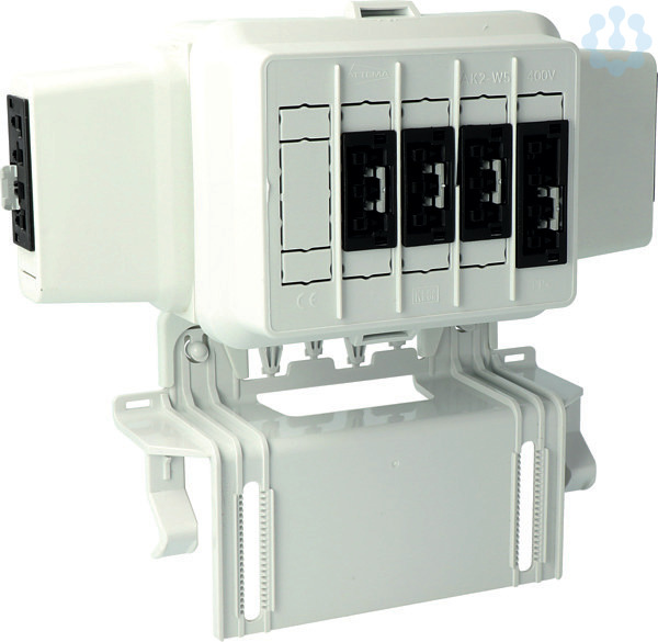 Steckbar 100% Gehäuse AK2, WAGO WINSTA, in:4pol sw, out:3x3pol swL1, 1x4pol L1+2, inkl. Montageplatte gewinkelt