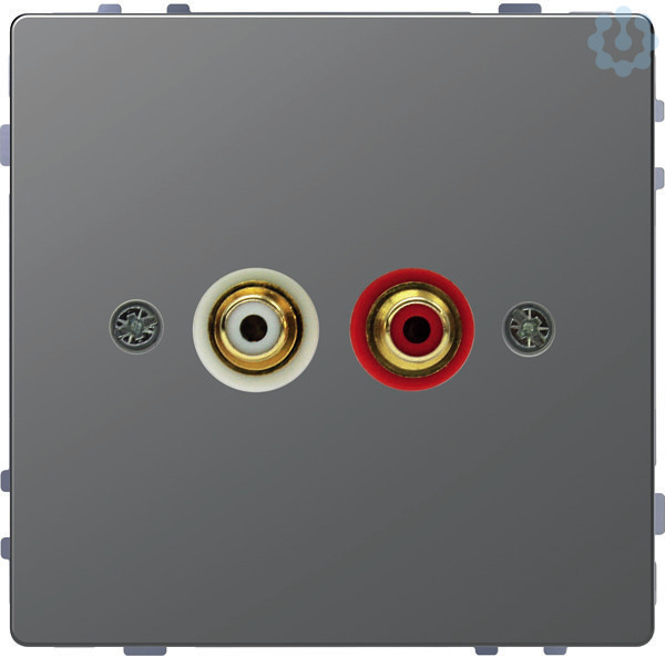 Mit zwei Chinch-Steckbuchsen. Farben Rot und Weiß. Vergoldete Kontakte. Kontakte mit Lötanschlüssen. Material Thermoplast lackiert. Farbe Edelstahl.