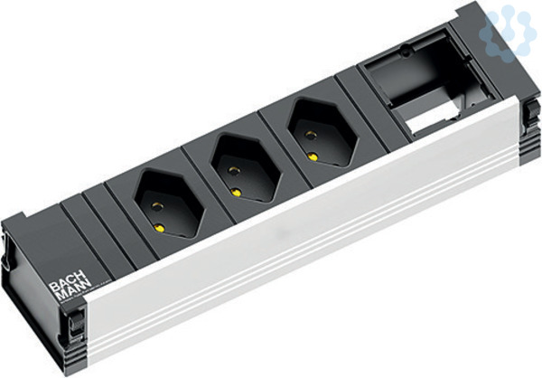 CONI Steckdoseneinheit ALU Länge: 3-fach / 217mm 3xCH/Schweiz schwarz, mit Thermosicherung 10A 1xCustom Modul leer. Stromeingang: 0,20m H05VV-F 3G1,50mm² schwarz mit Wieland GST18 Steckverbinder.