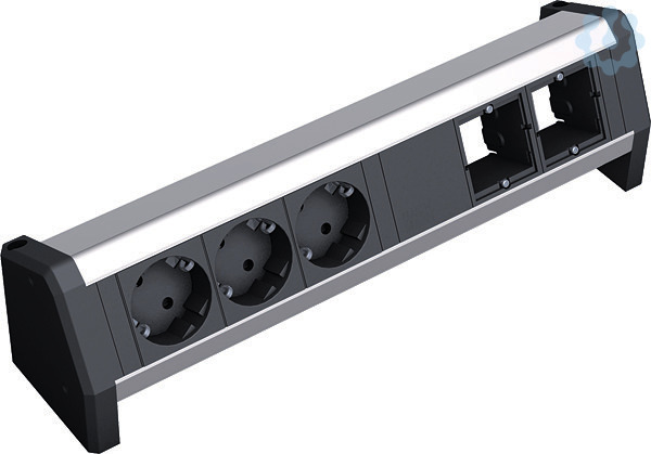 DESK Steckdoseneinheit ALU mit erhöhtem Berührungsschutz 3xSchutzkontaktsteckdose sw. 2xCustom Modul leer. GST18 Stromein- und ausgang.