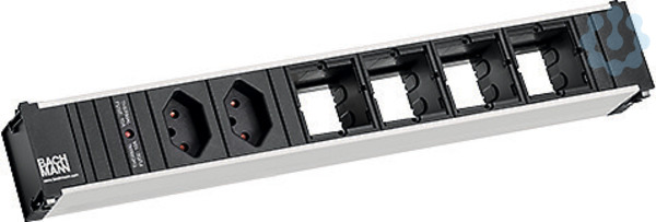 CONI Steckdoseneinheit ALU 6fach / L: 356mm. 2xCH/Schweiz sw. mit Thermosicherung 10A 4xCustom Module leer Stromeingang: 0,20m H05VV-F 3G1,50mm² schwarz mit Wieland GST18 Steckverbinder.