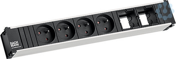 CONI Steckdoseneinheit ALU Länge: 6-fach / 356mm 4xUTE/Frankreich mit erhöhtem Berührungsschutz sw.,2xCustom Module leer Stromeingang: 0,20m H05VV-F 3G1,50mm² schwarz mit Wieland GST18 Steckverbinder.