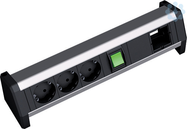 DESK Steckdoseneinheit ALU mit erhöhtem Berührungsschutz. 1xSchalter beleuchtet 2-polig, schaltet Steckdosen und Stromausgang. 3xSchutzkontaktsteckdose sw. 1xCustom Modul leer GST18 Stromein- und ausgang.
