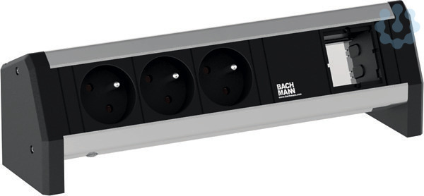 DESK Steckdoseneinheit ALU 3xUTE Steckdosen Frankreich schwarz 1xCustom Modul leer Stromeingang und -ausgang GST18 mit Bachmann Logo verpackt im Karton