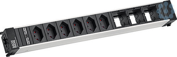 CONFERENCE Steckdoseneinheit ALU Länge: 444mm 6xCH/Schweiz sw. mit Thermosicherung 10A 3xCustom Module leer. Stromein- und ausgang GST18