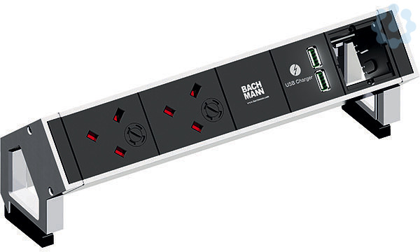 DESK 2 Steckdoseneinheit ALU. mit erhöhtem Berührungsschutz. weiß lackiert RAL 9010 Glanzgrad 30. 2xUK 3,15A sw 45°. 1xUSB Doppelcharger USB 2.0 Charger 5V 3,1A 1xCustom Modul leer. Strom 0,2m H05VV-F3G1,5mm² sw mit GST18i3 Stecker sw. im Karton. inkl. Haltewinkel