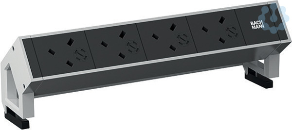 DESK 2 Steckdoseneinheit ALU. mit KS. weiß lackiert RAL 9010 Glanzgrad 30. 4xUK 3,15A sw 45°. Strom 0,2m H05VV-F3G1,5mm² sw mit GST18i3 Stecker sw. Bachmann Bedruckung. im Karton. inkl. Halte- winkel
