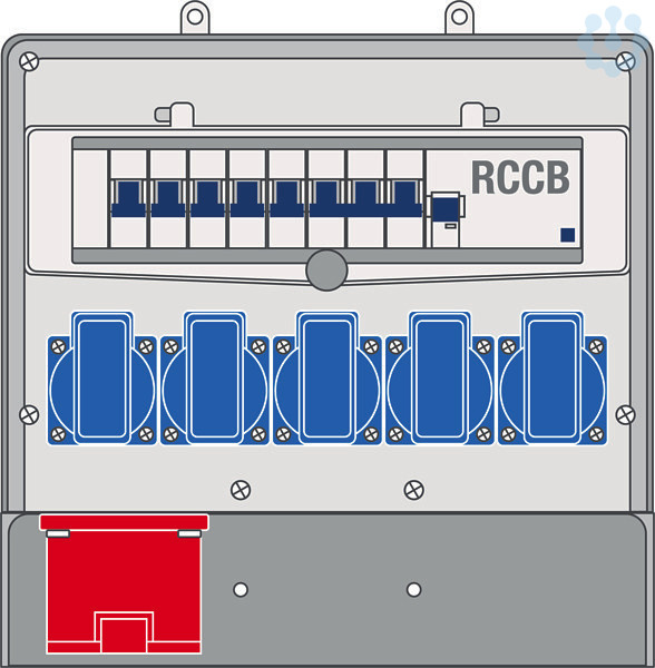 Die Steckdosenkombination für Wandmontage ist anschlussfertig verdrahtet. Jede Kombination, einschließlich der Einbaugeräte, ist stückgeprüft nach EN 61439-3. Die gesamte Kombination ist spritzwassergeschützt nach IP 44. Das Gehäuse wird aus dem Kunststoff Polyamid gefertigt. Dieser hochwertige Kunststoff zeichnet sich besonders durch seine hervorragende Festigkeit und Zähigkeit aus. Die Gehäusefarbe ist lichtgrau (elektrograu). Ohne Einbauten hat die Kombination die Abmessung von (HxBxT) 294 x 292 x 109 mm. Unterhalb eines Klarsichtfensters befinden sich die Reiheneinbaugeräte, die auf einer Tragschiene für 13 Teilungseinheiten montiert sind. Das Klappfenster ist selbstschließend und plombierbar. Die Bestückung und Absicherung setzt sich wie folgt zusammen: 1 x CEE-Steckdosen 5/16 A, 5 x SCHUKO-Steckdosen, 1 x FI-Schalter 4/40/0,03 A, 5 x LS-Schalter 16A 1-pol. C, 1 x LS-Schalter 16A 3-pol. C. Das Gehäuse hat zwei Leitungseinführungen M40 oben, die mit Blindstopfen verschlossen sind. Ein Klemmstein zum Weite