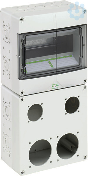 Steckdosenverteiler, leer, zum kundenseitigen Einbau von Reiheneinbaugeräten, Schutzkontakt-Steckdosen und CEE-Steckdosen, inkl. PE-/N-Klemme sowie Adaptern und Schrauben zur Montage der Steckdosen, hohe mechanische Belastbarkeit, temperaturunempfindlich, kombinierbar, Teilungseinheiten: 9TE2 x Bohrung für Steckdose mit Durchmesser 44,5mm und Bohrlochabstand für Montage vertikal / horizontal von 38/38mm (frontseitig)2 x Bohrung für Steckdose mit Durchmesser 66,5mm und Bohrlochabstand für Montage vertikal / horizontal von 60/60mm (frontseitig)