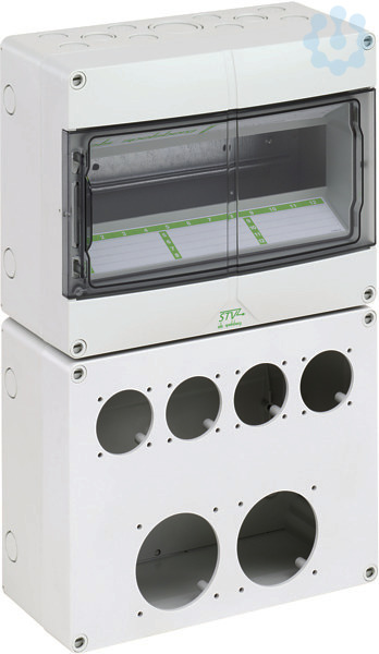 Steckdosenverteiler, leer, zum kundenseitigen Einbau von Reiheneinbaugeräten, Schutzkontakt-Steckdosen und CEE-Steckdosen, inkl. PE-/N-Klemme sowie Adaptern und Schrauben zur Montage der Steckdosen, hohe mechanische Belastbarkeit, temperaturunempfindlich, kombinierbar, Teilungseinheiten: 12TE4 x Bohrung für Steckdose mit Durchmesser 44,5mm und Bohrlochabstand für Montage vertikal / horizontal von 38/38mm (frontseitig)2 x Bohrung für Steckdose mit Durchmesser 66,5mm und Bohrlochabstand für Montage vertikal / horizontal von 60/60mm (frontseitig)