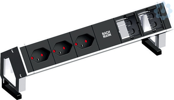 DESK2 Steckdoseneinheit ALU Farbe weiss, ähnlich RAL9010 ohne erhöhtem Berührungsschutz 3xCH Steckdosen Schweiz 90°, schwarz mit Thermosicherung 10A 2xCustom Module leer Zuleitung 0,2m H05VV-F3G1,5mm² schwarz mit GST18i3 Stecker inkl. Haltewinkel mit Bachmann Logo verpackt im Karton