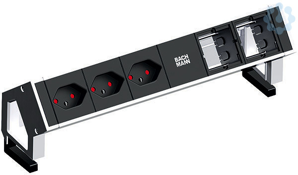 DESK2 Steckdoseneinheit ALU Farbe weiss, ähnlich RAL9010 ohne erhöhtem Berührungsschutz 3xCH Steckdosen Schweiz 90°, schwarz mit Thermosicherung 10A 2xCustom Module leer Zuleitung 0,2m H05VV-F3G1,5mm² schwarz mit GST18i3 Stecker inkl. Haltewinkel mit Bachmann Logo verpackt im Karton