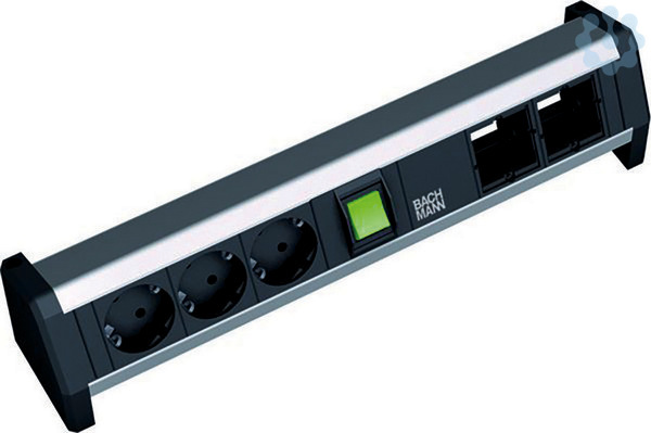 DESK Steckdoseneinheit Aluminium mit erhöhtem Berührungsschutz, 1xSchalter beleuchtet 2-polig, schaltet Steckdosen und Stromausgang. 3xSchutzkontaktsteckdose schwarz 2xCustom Module leer. GST18 Stromein- und ausgang.
