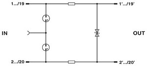 LSA-PLUS-Stecker (COMTRAB CT 10) mit Überspannungsgrob-/feinschutz und Entkopplungswiderstand für 10 erdpotenzialfrei betriebene Signalkreise. Nennspannung: 24 V DC. Ausführung: 10 Doppeladern