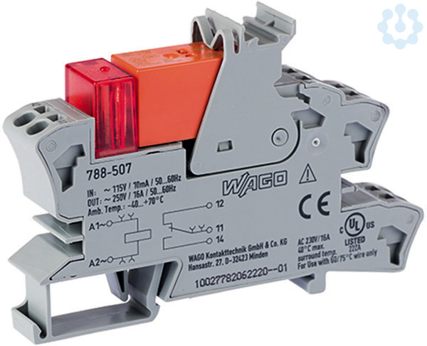 Relaismodul. Eingangsnennspannung AC 115 V. 1 Wechsler. Grenzdauerstrom 16 A. Statusanzeige rot. 15 mm Baubreite. 2,50 mm². grau