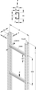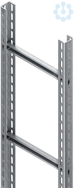 Steigetrasse nach DIN EN 61537, bestehend aus 2 dreiseitig durchgehend perforierten Profilen U 6040 und einschraubbaren C-Profil Sprossen 2986 mit 18 mm Schlitzweite, einschließlich feuerverzinkten anteilmäßigem Befestigungszubehör. Die durchgehende Perforation der Seitenholme ermöglicht den Einbau zusätzlicher Sprossen, beispielsweise wechselseitig, für beidseitige Belegung. Die Lieferung erfolgt aus transporttechnischen Gründen als Bausatz. Passende Bügelschellen (BU... und BUK...).
