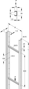 Steigetrasse nach DIN EN 61537, für die Wandmontage, mit durchgehend perforierten und profilierten Seitenholmen, mit eingenieteten Sprossen aus C-Profilen mit 16 mm Schlitzweite. Passende Bügelschellen (B...).