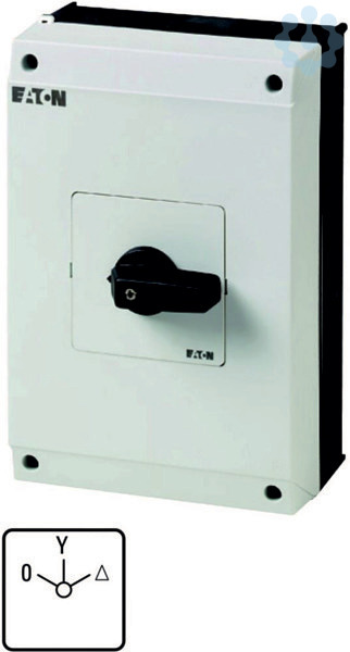Stern-Dreieck-Schalter, Sortiment: Steuerschalter, Typkenner: T5B, mit schwarzem Knebel und Frontschild, Kontakte: 8, Schutzart: IP65, Bauform: Aufbau, Schaltwinkel: 60 °, Schaltverhalten: rastend, mit 0-Stellung, Frontschild: 0-Y-D, Bemessungsbetriebsleistung AC-23A, 50 - 60 Hz 400 V: P = 30 kW, Bemessungsdauerstrom: Iu = 63 A, 4 Baueinheit(en), Normen und Bestimmungen: IEC/EN 60947, VDE 0660, IEC/EN 60204, CSA, UL, Lasttrennschalter nach IEC/EN 60947-3