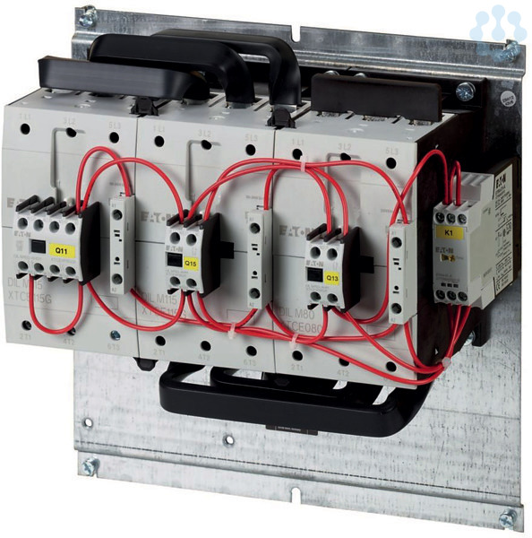 Stern-Dreieck-Schützkombination, Applikation: Schützkombinationen für den Motorstart im Stern-Dreieck, Schalthäufigkeit: max. 30 Anläufe/Stunde, Zubehör: Stern-Dreieck-Kombinationen SDAINL, Gebrauchskategorie: AC-3: Käfigläufermotoren: Anlassen, Ausschalten während des Laufes, Bemessungsbetriebsstrom AC-3 380 V 400 V: Ie= 140 A, max. Bemessungsbetriebsleistung Drehstrommotoren 50 - 60 Hz AC-3 220 V 230 V: P= 37 kW, 380 V 400 V: P= 75 kW, 500 V: P= 90 kW, 660 V 690 V: P= 90 kW, max. Umschaltzeit: 20 s, Betätigungsspannung: 230 V 50 Hz, 240 V 60 Hz, Stromart AC/DC: Wechselstrombetätigung, Einzelkomponenten der Kombination Netzschütz Q11: DILM80, + DILM150-XHI31, Dreieckschütz Q15: DILM80, + DILM150-XHI11 Typ, Sternschütz Q13: DILM50, + DILM150-XHI11 Typ, Zeitrelais K1: ETR4-51 Typ, Hinweis: Geeignet auch für Motoren der Effizienzklasse IE3