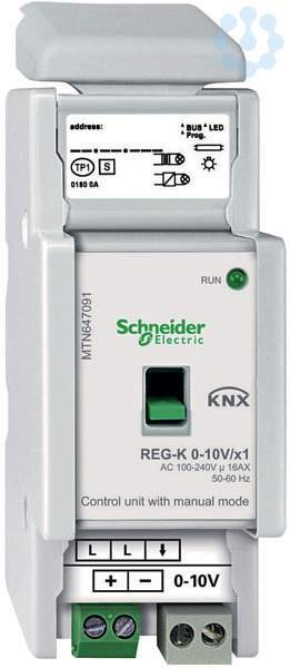 Schneider Electric KNX. Zum Anschluss von Geräten mit 0-10 V-Schnittstelle an KNX. Mit integriertem Busankoppler und Schraubklemmen (230 V) bzw steckbaren Schraubklemmen (0-10 V). Mit jeweils einem Handschalter kann der entsprechende 230 V-Schaltausgang manuell betätigt werden. Für die Montage auf Hutschienen TH35 nach EN 60715. Der Busanschluss erfolgt über eine Busanschlussklemme, eine Datenschiene ist nicht erforderlich. Schaltkontakt: zum Schalten der EVGs/Trafos. Nennspannung: AC 230 V, 50-60 Hz Nennstrom: 16 A, cos Phi 0,6 Schaltleistung: AC 230 V, 3600 W, cos Phi 1 Kapazitive Last: AC 230 V, 16 A, 200 uF Glühlampen: AC 230 V, max 3600 W. Halogenlampen: AC 230 V, max 2500 W Leuchtstofflampen: AC 230 V, max 3600 VA, unkompensiert AC 230 V, max 2500 VA, parallelkompensiert NV-Halogenlampen mit gewickeltem Trafo: max 2000 VA 0-10v. Schnittstelle: 0,12-100 mA Spannungsbereich: DC 0-10 V Gerätebreite: 2,5 TE entspricht ca 45 mm Lieferumfang: Mit Busanschlussklemme und Leitungsabdeckung.