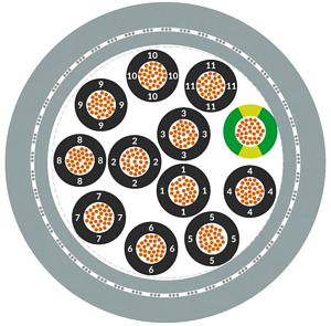 Anlagenbau Maschinenbau Heiz- und Klimatechnik, In EMV kritischer Umgebung (Elektromagnetische Verträglichkeit), Überwiegend in trockenen, feuchten und nassen Räumen (auch Wasser-Öl-Gemische), jedoch nicht im Freien, Feste Verlegung als auch gelegentlich flexible Anwendung bei freier, nicht ständig wiederkehrender Bewegung ohne Zugbelastung oder zwangsweiser Führung und mittlerer mechanischer Beanspruchung, Hinweis: Verwendung von Leitungen des Typs AWM (Appliance Wiring Material) in Industriemaschinen (USA) nach NFPA 79 Ed. 2015: siehe Kataloganhang Tabelle T29, Breite Einsatzmöglichkeit durch mehrfache Zertifizierungen, Feindrähtige Litze aus blanken Kupferdrähten, PVC Aderisolation, PVC- Innenmantel, grau, Kupfergeflecht, verzinnt, Mantel aus PVC, erhöht ölbeständig, grau (RAL 7001), Adern in Lagen verseilt, Multinormleitungen sind in metrischen Nennquerschnitten in mm² oder AWG/kcmil-Nenngrößen ausgeführt. Der führende Querschnitt ist in untenstehender Tabelle genannt, der jeweils zuordenbare Querschnitt