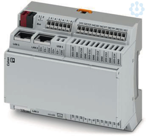Steuerung für die Gebäudeautomation. 14 konfigurierbare Ein- und Ausgänge. Schnittstellen: 3 x Ethernet, 2 x RS-485, 2 x USB-C, TP für Raumautomation, 2 x SPE für Catan-Erweiterungsmodule. Lokale Vorrangbedienung über Catan Control Panel.