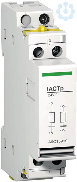 Störspannungsbegrenzer Acti 9 iACTp. Betriebsspannung (Ue) 48-127V AC. Begrenzt Überspannungen im Steuerstromkreis. Die Montage erfolgt linksseitig am iCT mit gelben Clips oder mit Verdrahtung.