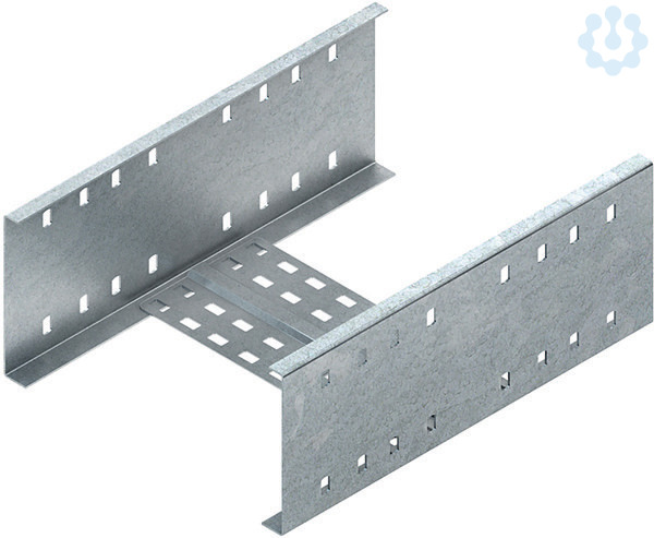 Stoßstellenverbinder, dreiteilig, für die elektrische und an der Stoßstelle formschlüssig in Längsrichtung fluchtende Verbindung von schweren Kabelrinnen bzw. Verteilerrinnen, einschließlich feuerverzinkten anteilmäßigem Befestigungszubehör.